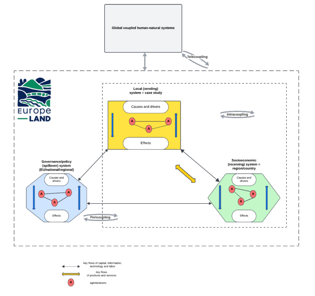 The Europe-LAND framework also incorporates insights on coupled human and natural systems and emerging concepts such as metacoupling, emphasizing that local, adjacent, and distant interactions must all be considered when analyzing land-use trajectories. This expanded perspective allows Europe-LAND to better understand regional differences, feedback loops, and the interconnectedness of various socio-environmental factors influencing land-use